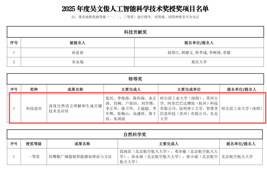 近日,中国人工智能学会正式揭晓2025年度“吴文俊人工智能科学技术奖”授奖名单。昆明理工大学信息工程与自动化学院余正涛教授、高盛祥教授、黄于欣教授作为核心完成人参与的“深度自然语言理解和生成关键技术及应用”项目,荣获吴文俊人工智能科技进步特等奖。2025年度,吴文俊人工智能科学技术奖共授奖116项成果及个人,其中科技进步奖特等奖仅1项,这是我国智能科学技术领域最高荣誉之一。此次获奖也标志着昆明理工大学在人工智能尤其是自然语言处理领域的研究实力跻身全国顶尖行列。此次荣获特等奖的“...