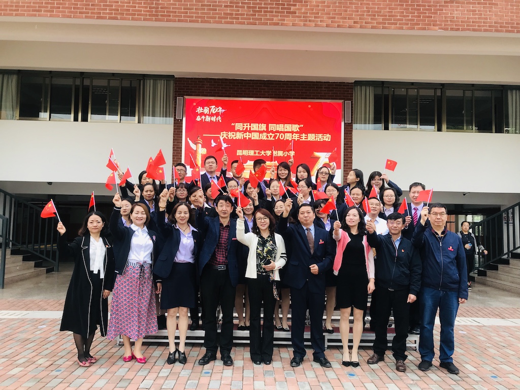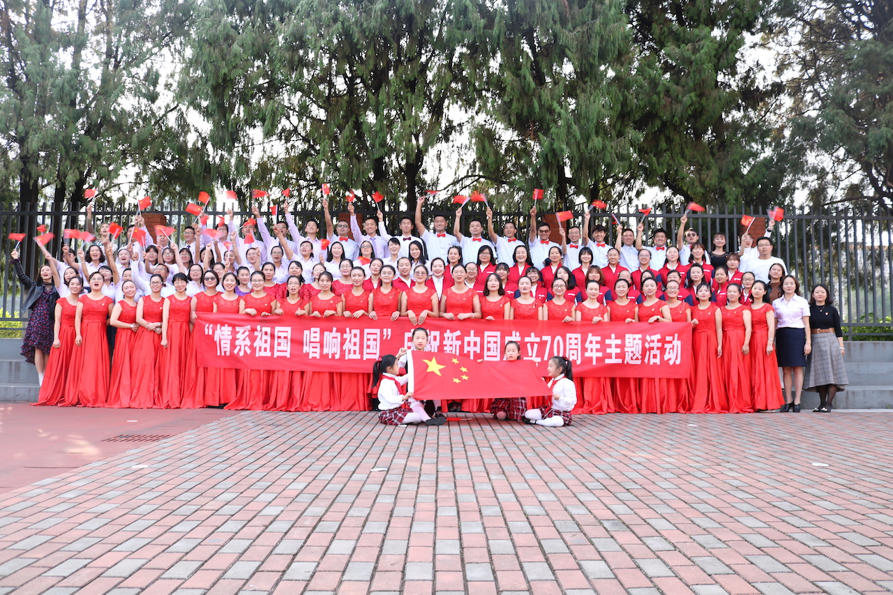 升旗仪式结束后,附小全校师生挥动国旗,高唱《我和我的祖国》;附中师生在横幅上签名并写下对祖国的美好祝福;附属幼儿园师生展示了“我爱你中国”的歌曲表演。