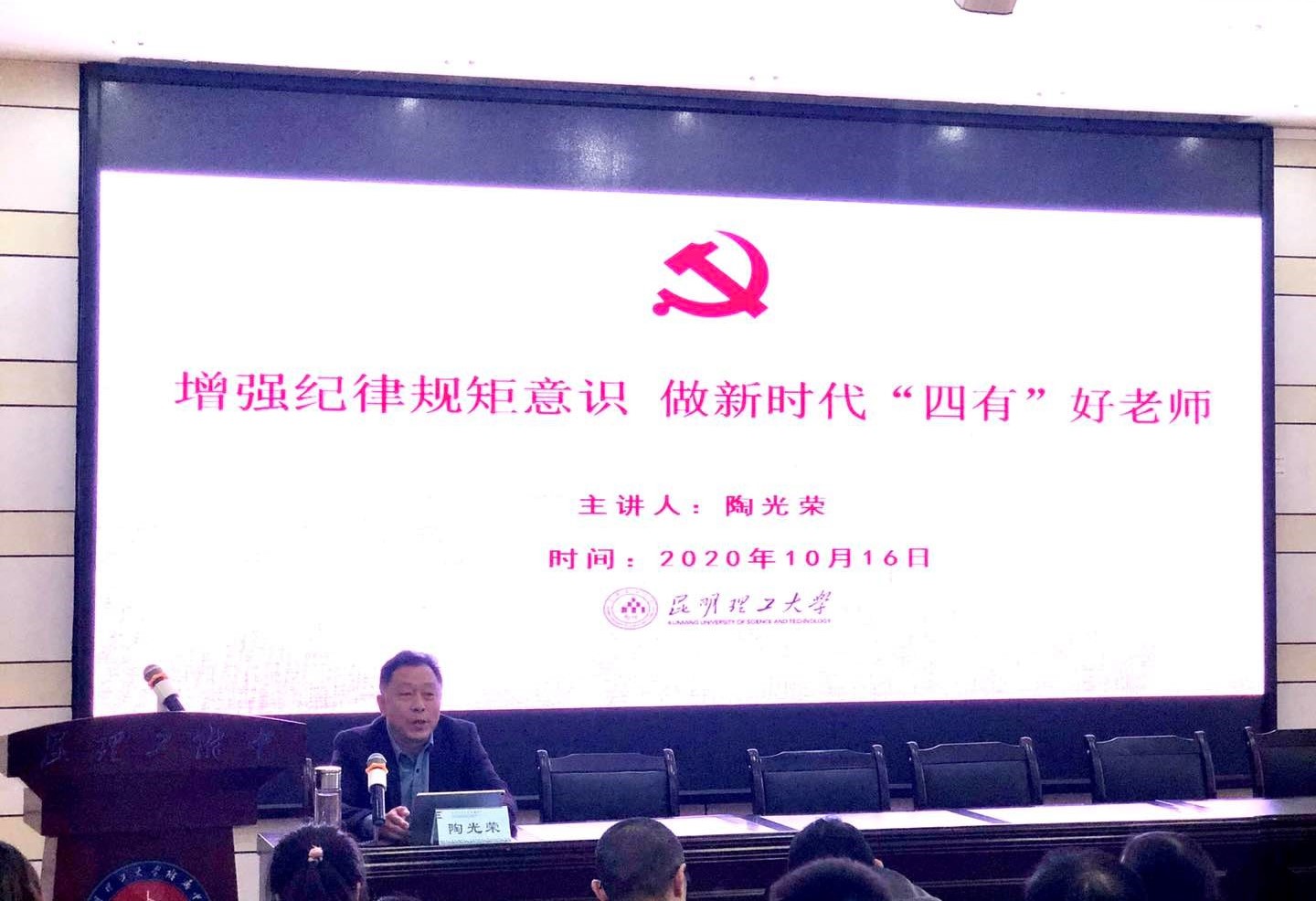 10月16日,昆明理工大学党委常委、纪委书记陶光荣分别为国资学院、教育发展公司党员干部上党课。纪检监察室党员、国资学院党员、教育发展公司党员等共计500余人参加党课学习。