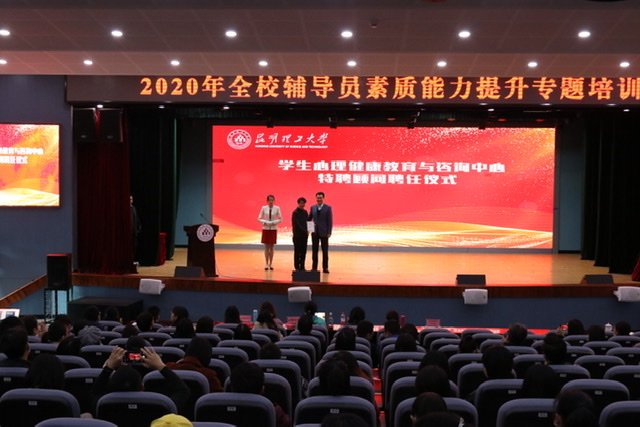 11月13日上午,北京大学心理健康教育与咨询中心副主任徐凯文受聘为学校学生心理健康教育与咨询中心特聘顾问。聘任仪式在呈贡校区西南区小剧场举行,学生工作部(处)主要负责人为徐凯文颁发了聘书,全校专、兼职辅导员200余人参加聘任仪式。