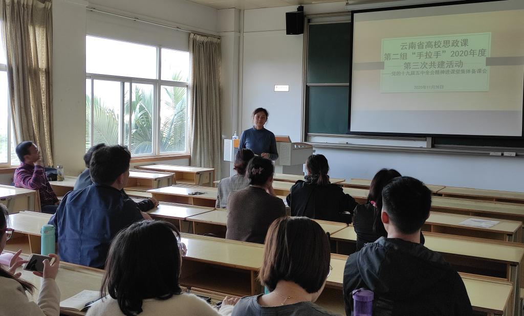 11月28日,云南省高校思想政治理论课教育教学“手拉手”共建活动第二组第四次交流学习活动在红河学院举行,并就党的十九届五中全会精神进课堂进行集体备课会。第二组共建单位昆明理工大学、红河学院、云南师范大学商学院、云南交通职业技术学院、红河卫生职业学院等高校的马克思主义学院、思政部负责人、教师代表共计48人参加了本次共建活动,并特邀红河州图书馆馆长赵正良参加指导。