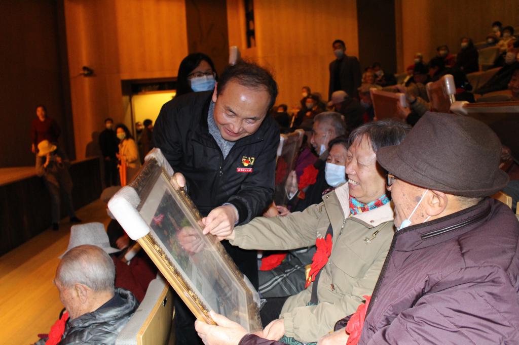 庆典上,参会领导为新增钻石婚、金婚老人颁发纪念照片,为年满90岁的长寿老人代表颁发“昆明理工大学长寿老人纪念牌”。