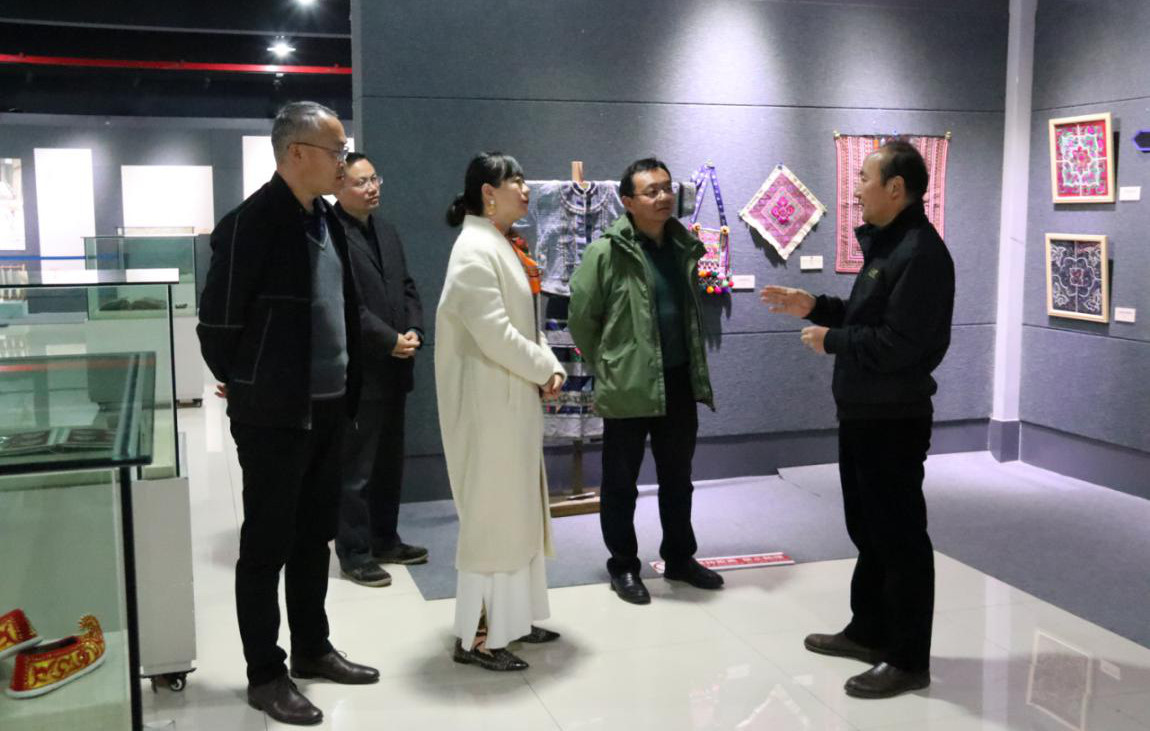 周峰越副校长先后参观了“纵横经纬的艺术·云南民族民间织、染、剪、绣”精品展和“云岭正当国潮时·云南民族文化创意产品”设计展,对艺术与传媒学院和云南民族博物馆馆校合作的教学模式表示肯定,认为该模式为学生搭建了实践与创新的平台,更有利于弘扬民族文化。