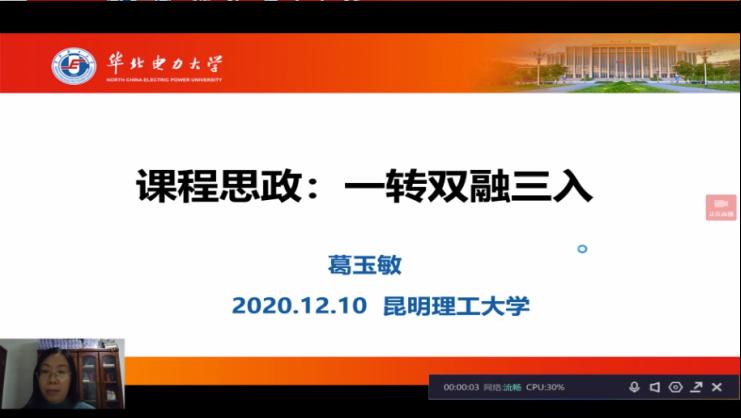 华北电力大学电力工程系葛玉敏老师以“课程思政:一转双融三入”为题进行了第一场报告。葛老师从教师观念的转变,多角度、多学科的融合,入脑入心入行的层面,结合电路原理课程为老师们展示了生动感人的一节示范课。