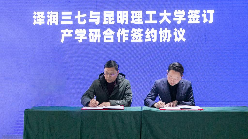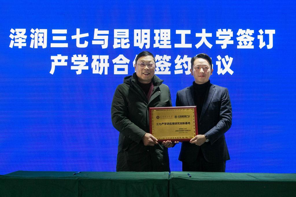 发布会上,昆明理工大学生命科学与技术学院与云南云泽润健康产业有限公司签订了产学研一体化合作协议。双方在合作方向上达成了共识,未来将在三七种植、药效成分提取、有效成分开发、科研平台建设、人才培养、成果转化等方面展开全方位、多层次的合作。其次双方将构建产学研结合的技术创新体系,提升三七应用研究的创新能力推动产业转型升级实现高质量发展和高效率成果转化,逐步建立“产、学、研”一体化平台。云南云泽润健康产业有限公司捐资50万元人民币,在昆明理工大学生命科学与技术学院设立“泽润三七奖学奖教金”。
