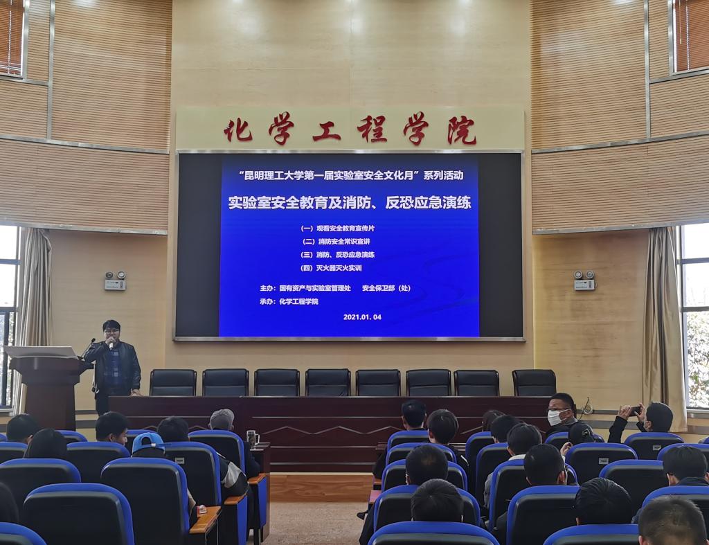 1月4日下午,学校在化工楼开展了实验室安全教育及消防应急演练活动。本次活动由国有资产与实验室管理处、安全保卫处主办,化学工程学院承办,作为“昆明理工大学第一届实验室安全文化月”系列活动之一,活动也得到校医院等多部门配合。国有资产与实验室管理处、安全保卫处、化工学院、校医院相关负责人,化学工程学院研究生代表共计200余人参加活动。