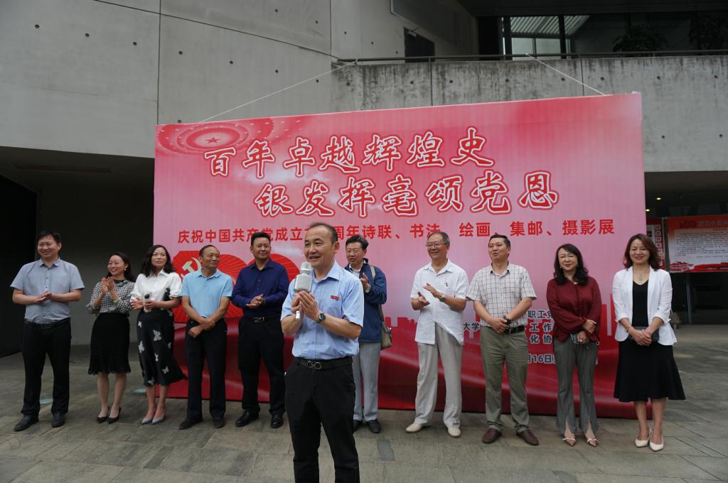 6月16日上午,由昆明理工大学离退休教职工党委、离退休工作处主办,学校老年文化协会承办的“百年卓越辉煌史,银发挥毫颂党恩”离退休教职庆祝中国共产党成立100周年诗联、书法、绘画、集邮、摄影展在莲华伍集成会堂开幕。校党委常委、副校长周峰越副校长,教育发展公司、附属中小学负责人,文化协会会员,以及受邀的云南省老干部花卉盆景协会、集邮协会、云南财经大学、云南农业大学等兄弟院校协会负责人等共计100余人参加了开幕式。