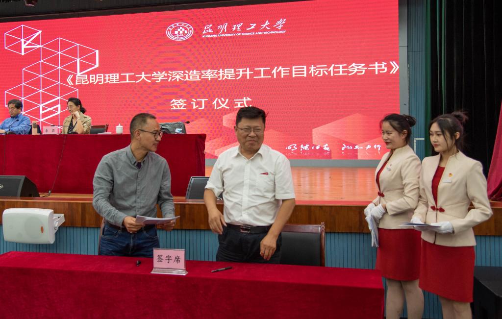 会上,周峰越、束洪春代表学校,与信自、环工、管经、理学、材料、生科、外文、医学院签订了《昆明理工大学深造率提升工作目标任务书》。