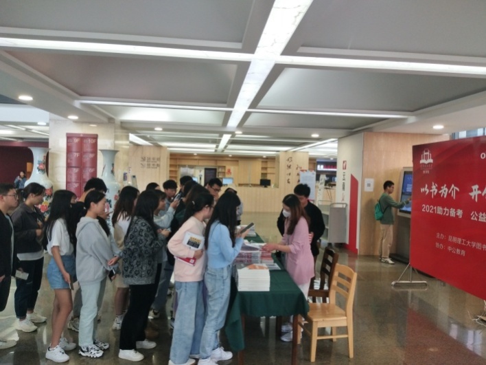 为了更好的帮助学校有考研和考公务员需求的同学,9月29至30日,图书馆在二楼大厅开展“以书为介 开创未来”为主题的考研、考公书籍公益赠书活动。本次活动由图书馆、中公教育联合举办,面向全体读者免费发放考公、考研备考学习书籍14种近800册。来自全校各个学院的学生600余人到现场领取书籍,并体验考研视频学习、电子图书、在线考试等数据库。
