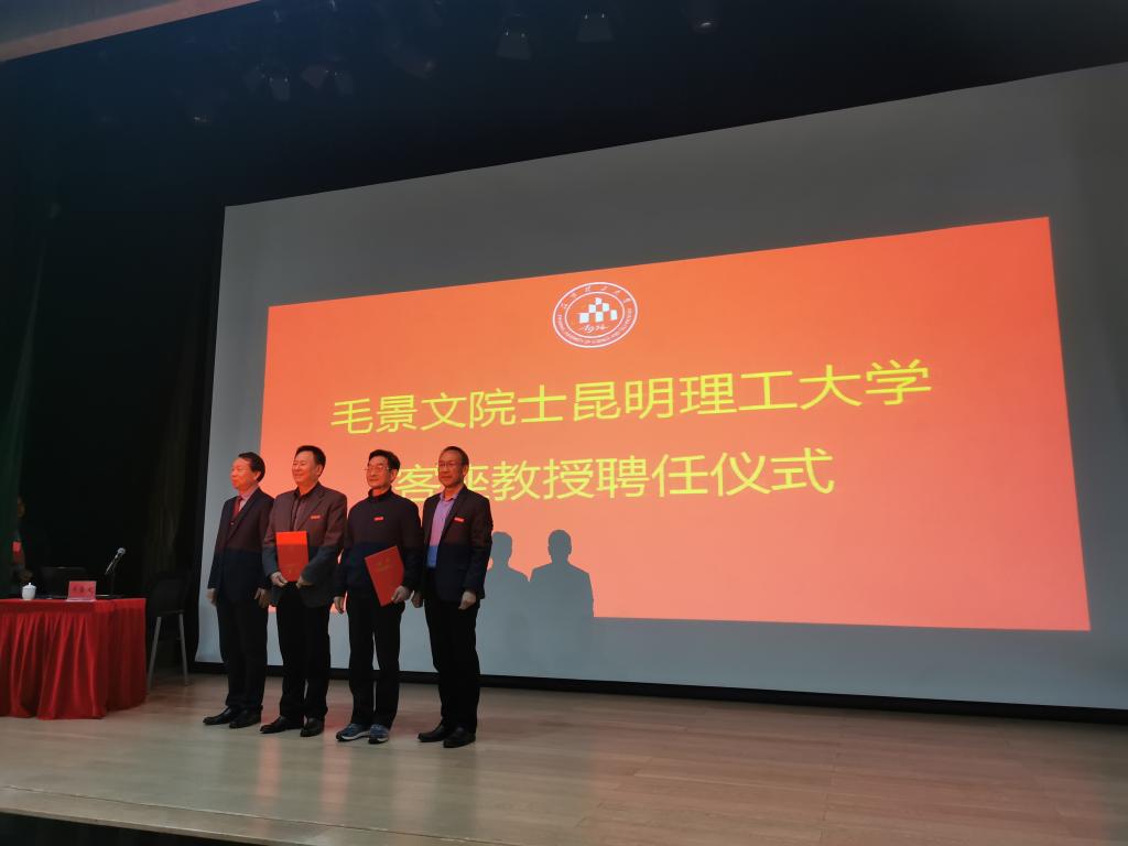 11月19日,中国工程院毛景文院士,中国产学研合作促进会党委委员、教育部高等学校地质类专业教学指导委员会副主任刘玉强研究员受聘为昆明理工大学客座教授,校党委常委、副校长杨斌出席聘任仪式并颁发证书。