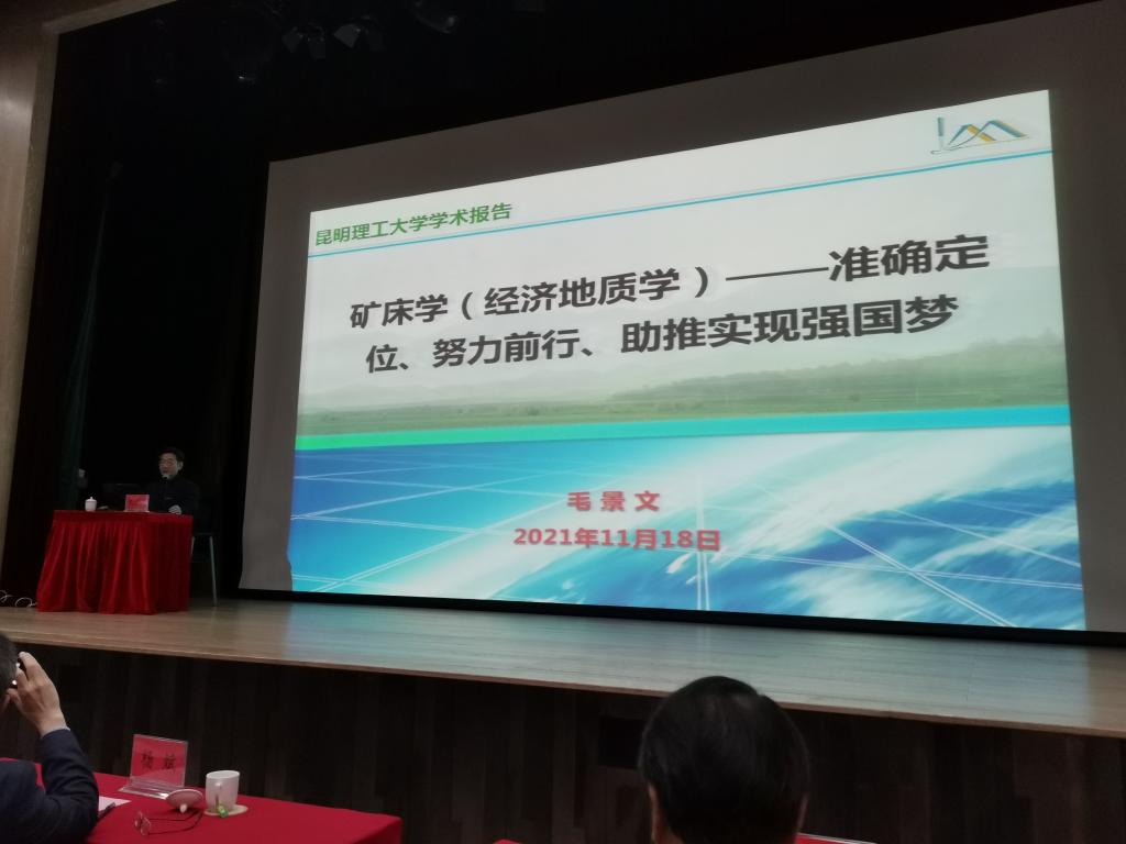 聘任仪式后,毛景文院士作了题为《矿床学(经济地质学)—准确定位、努力前行、助推实现强国梦用》的学术报告,介绍了国内外矿床学研究现状和发展动态,深入剖析了西方国家和我国目前对于矿床学认知的差异,为在场师生讲解对于如何学习矿床学和开展矿床学研究。他鼓励广大青年学者和学生,要注重野外研究基础,善于思考,勇于创新,占领学科制高点,提高国际话语权,为实现中国梦做出积极贡献。