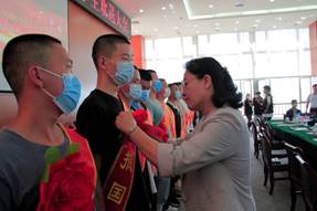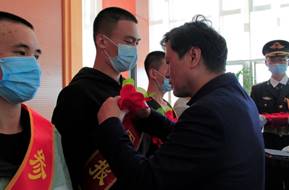 会议开始,李莉和易健宏为19名入伍学生代表佩戴红花,并颁发纪念品。
