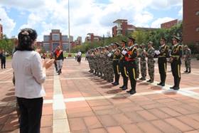 李莉代表学校对入伍学生及家长表示祝贺、向国防后备营的同学们表示感谢、向参与征兵工作的同志们表示慰问,并对参军入伍同学提了三点希望,一是不要忘记自己永是昆工学子,二是时刻谨记自己已是成熟青年,三是永远牢记自己就是中国军人。
