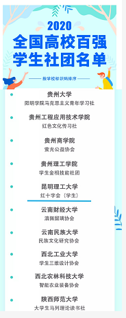 近日,2020年“寻找全国高校百强学生社团”活动落幕,经全国高校推荐、社团展示、网络投票、技术筛查、专家评审等环节,昆明理工大学红十字会(学生)入选2020全国高校百强学生社团名单。