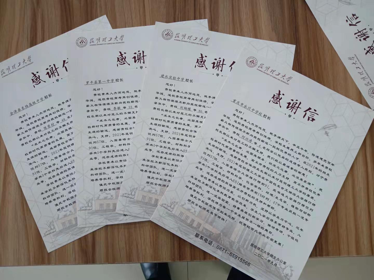 在中秋国庆佳节到来之际,学校向298所生源中学寄送感谢信,其中云南省内123所、省外175所,以表达对各生源中学的谢意和对师生的问候的同时,也向各生源中学通报学校近年来的办学取得的成绩。