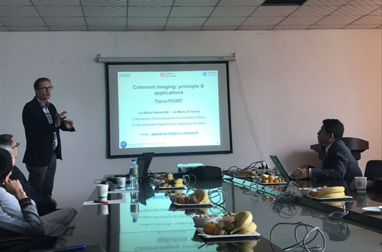 Pascal PICART教授以“Coherent imaging: principle and applications”为题,介绍了相干成像的基本原理和特点,着重讨论了与数字全息有关的图像编码与重建、和相干相位成像问题。报告中详细介绍了Pascal PICART教授团队在数字全息散斑及相位处理方面所做的工作,以及应用数字全息进行生物学显微测量、轮廓测量和振动测量等方面的工作。Pascal PICART教授还介绍了法国勒芒大学及其声学实验室的情况。