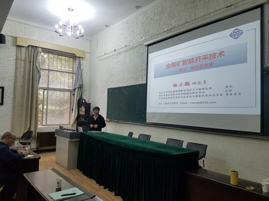 杨小聪研究员就我国地下矿山采矿生产中的凿岩-装药-铲装-运输这一主体作业流程,详细介绍了智能化无轨装备、井下无线通讯系统、地下金属矿开采智能调度与控制系统等先进的智能开采技术和设备,最后就师生们感兴趣的话题进行了探讨交流。