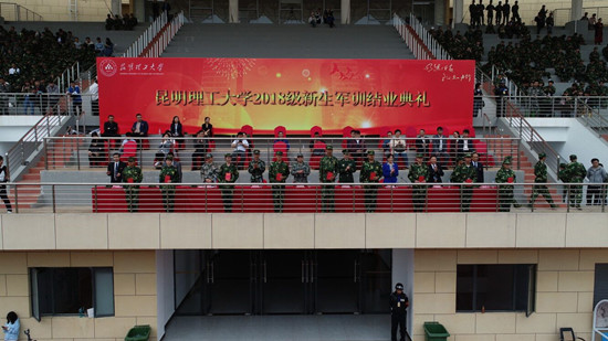9月9日上午,昆明理工大学2018级新生军训结业典礼在呈贡校区2号体育场隆重举行。校党委副书记、校长王学勤,校党委副书记李莉,副校长牛治亮,校纪委书记陶光荣,副校长束洪春、杨斌、马文会,承训部队武警机动第八支队徐山东上校、李永林中校出席典礼。党办、校办、党委宣传部、武装部、学生处、后勤保障处、学生社区教育管理中心等职能部门及各学院党委负责人,承训部队官兵以及全体军训带队老师和2018级参训新生共计6000余人参加典礼。结训典礼分三个部分,由牛治亮副校长主持。