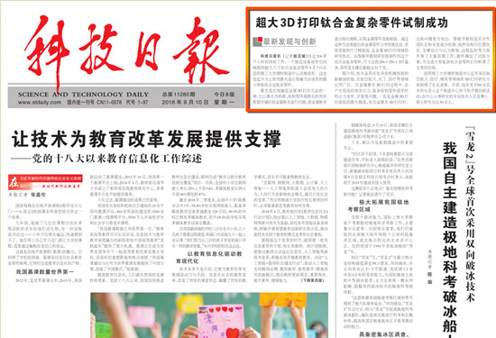 《科技日报》9月10日头版“报眼”要闻报道:昆明理工大学试制成功超大尺寸钛合金复杂零件。