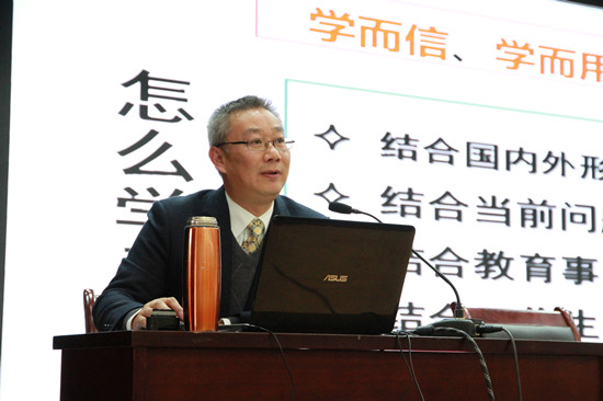 报告中,殷教授与大家分享学习十九大精神的体会,从为什么学、怎样学、学什么三个方面深刻阐述了党的十九大主题、主要成果,深入理解习近平新时代中国特色社会主义思想理论体系和对中国建设发展的思想引领,对过去5年中国的历史性成就和历史性变革有了更加清楚的认识,更加坚定中国特色社会主义进入新时代,了解了我国社会主要矛盾的变化,坚定不移推进全面从严治党。