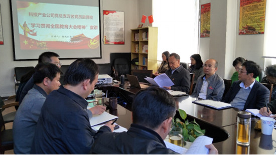 11月29日下午,科技产业公司党总支召开学习贯彻全国教育大会精神宣讲会,邀请校党委常委、副校长杨斌同志主讲,科技产业公司全体干部职工参加会议。杨斌副校长带领全体参会人员认真系统学习了大会的重要精神,并深刻解读了这次全国教育大会的精神内核。结合学校和科技产业公司的实际工作情况,杨副校长强调,全体干部职工要学习借鉴西方先进高等教育体系的管理经验,完善人的发展激励制度,正确处理发展中面临的困难,以学生为中心,提升服务师生的能力和水平,促进学校的全面发展,为学校的双一流建设事业做出更大的贡献。