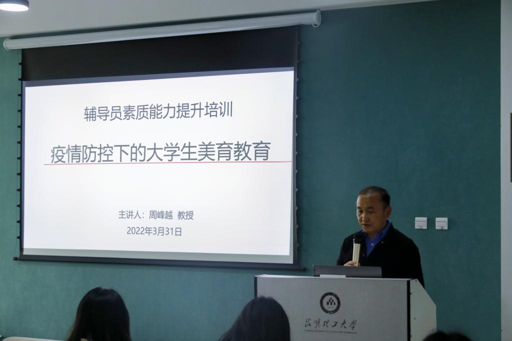 为提升学校辅导员在疫情防控特殊时期,做好学生的美育教育工作,引领学生树立正确的审美观念、陶冶高尚的道德情操、塑造美好心灵,以美育人、以美化人、以美培元。3月31日下午,昆明理工大学辅导员素质能力提升培训在呈贡校区建工楼5楼大厅举办。本次培训由校党委常委、副校长周峰越主讲,主题为“疫情防控下的大学生美育教育”。学校本科生、研究生专职辅导员代表参加培训。