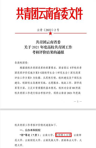 4月20日,共青团云南省委公布2021年度高校共青团工作考核评价结果,昆明理工大学获评“好”等次。