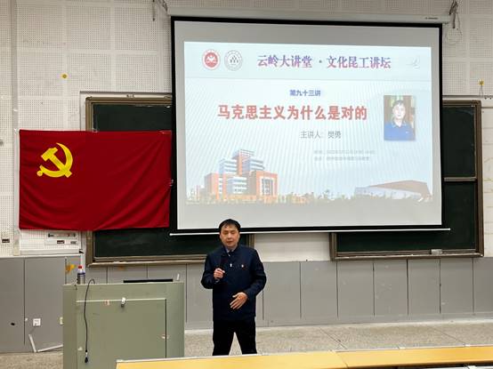 5月12日下午,云岭大讲堂·文化昆工讲坛系列讲座第九十三讲在理学楼附100教室举行。讲座邀请到昆明理工大学二级教授樊勇主讲,主题为“马克思主义为什么是对的”。本次讲座由理学院承办,采取线上线下方式同时进行,师生约500余人聆听了讲座。