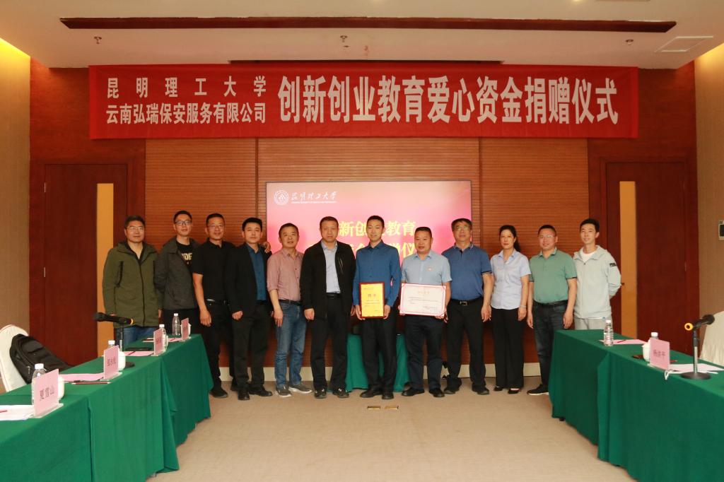 5月12日下午,昆明理工大学创新创业教育爱心资金捐赠仪式在昆明枫叶王府酒店举行。云南弘瑞保安服务有限公司捐赠10万元,用于“互联网+”大赛项目的培育和指导。副校长夏雪山,云南弘瑞保安服务有限公司总经理张述伟、副总经理杨洪平出席仪式。