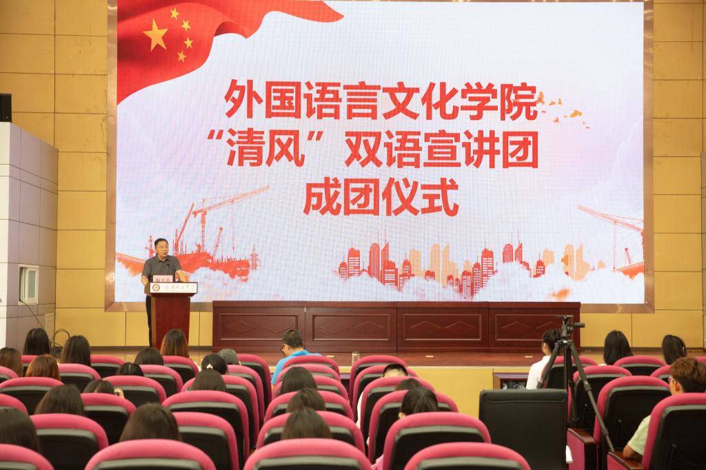 6月30日上午,外国语言文化学院“清风”双语宣讲团成团仪式在后勤一号楼报告厅举行。校党委常委、纪委书记陶光荣出席仪式。外文学院主要负责人、宣讲团首批成员和学院师生代表共150余人参加会议。