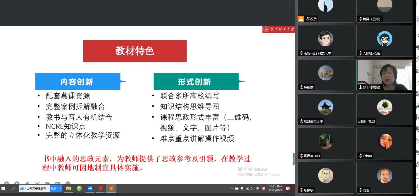 8月29日,教育部高等学校软件工程专业教学指导委员会以线上形式,召开推荐教材建设总结交流会。教指委副主任骆斌致辞,人民邮电出版社社长刘博作主题发言。昆明理工大学赵晓侠教授应邀参加会议并作教材建设经验分享。