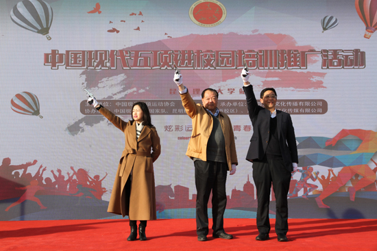 许海峰先生、张英杰书记、彭金辉校长一道为中国现代五项进校园活动鸣枪启幕。