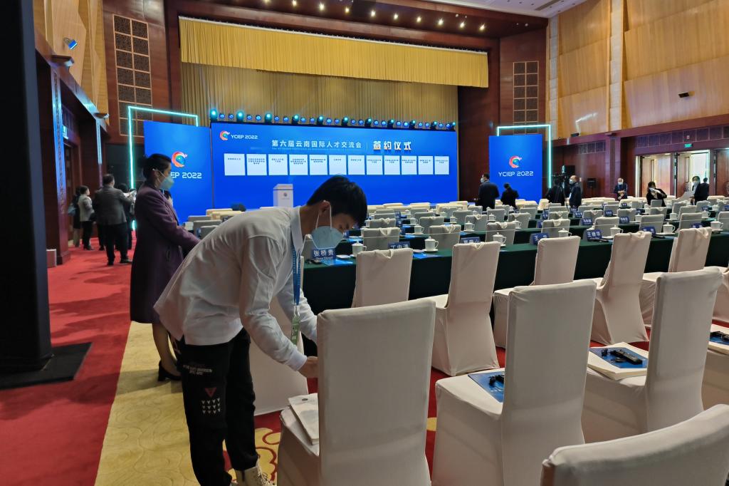11月10日,昆工青年志愿者按组委会统一要求,到大会指定地点进行集中管理,同时开展会场布置、材料装订、嘉宾引导、后勤保障、会场引导、签约引导等工作。