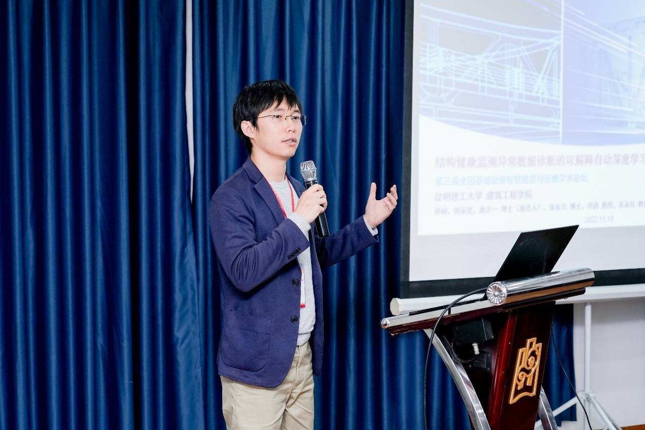 2022年11月18日至20日,第三届全国基础设施智慧建造与运维学术论坛在南京成功举办。昆明理工大学建筑工程学院唐志一博士应邀作题为“结构健康监测异常数据诊断的可解释自动深度学习方法”的人工智能与大数据分论坛报告。