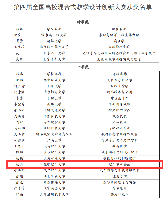 11月28日,第四届全国高校混合式教学设计创新大赛结果揭晓,昆明理工大学杨玉荣获一等奖,谢晓丽荣获三等奖,史世伦、朱慧斌获得“设计之星”。
