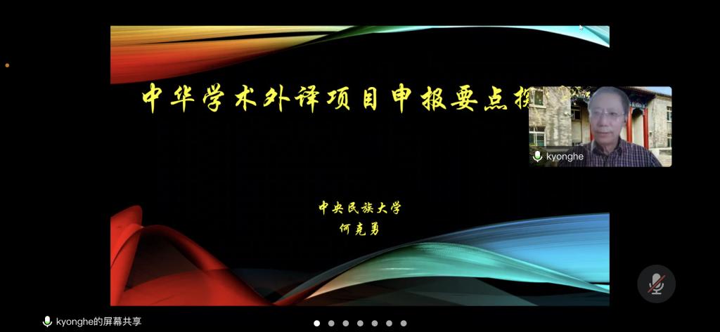 11月29日晚,昆明理工大学举办国家社科基金中华学术外译项目申报讲座。中央民族大学何克勇教授作题为“中华学术外译项目申报要点探讨”的专题辅导讲座,昆明理工大学外国语言文化学院洪涛副教授分享了中华学术外译项目申报注意事项。自昆明理工大学、云南大学、云南师范大学、云南民族大学的60余名老师通过腾讯会议参加辅导。