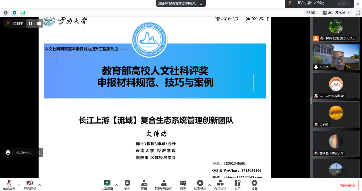12月5日,昆明理工大学举办教育部高校科研优秀成果奖申报培训会。会议邀请到第八届教育部高校人文社科优秀成果一等奖获得者、教育部人文社科重点研究基地和国家哲学社会科学基金重大招标项目首席专家文传浩教授带来题为“教育部高校人文社科评奖申报材料规范、技巧与案例”的专题辅导。校党委常委、副校长王启梁,党委常委、校长助理陈晔出席会议,100余名教师通过线上参加培训会。