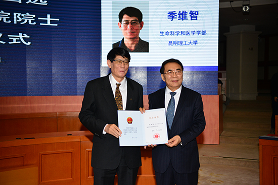 11月28日,中国科学院官方网站公布了2017年中国科学院新增选院士名单,昆明理工大学特聘教授、昆明理工大学灵长类转化医学研究院院长季维智研究员当选为中科院生命科学和医学学部院士。根据《中国科学院院士章程》和《中国科学院院士增选工作实施细则》的规定,2017年中国科学院选举产生了61名中国科学院院士和16名中国科学院外籍院士,其中数学物理学部11人、化学部9人、生命科学和医学部13人、地学部10人、信息技术科学部6人、技术科学部12人。季维智教授以在灵长类生殖生物学研究领域做出的卓越贡献成功当选,成为昆明理工大学首位中科院院士。