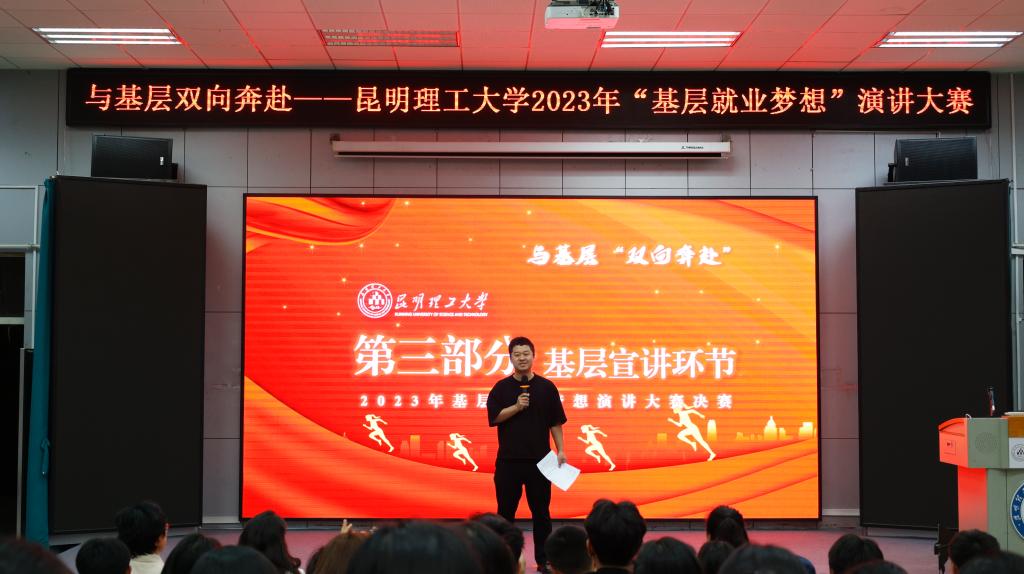 为深入贯彻落实党的二十大精神和习近平总书记给中国农业大学科技小院同学回信重要精神,在校内营造学习贯彻习近平新时代中国特色社会主义思想主题教育浓厚氛围,教育引导广大青年学子到基层建功立业,5月10日晚,“与基层双向奔赴——昆明理工大学2023年‘基层就业梦想’”演讲大赛在呈贡校区落下帷幕。