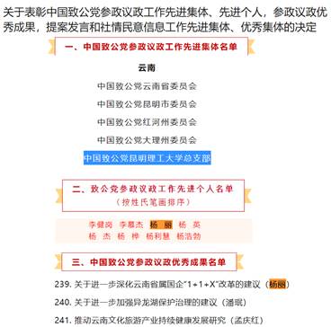 5月24日,致公党中央发布了《关于表彰中国致公党参政议政工作先进集体、先进个人,参政议政优秀成果,提案发言和社情民意信息工作先进集体、优秀集体的决定》,中国致公党昆明理工大学总支部被致公党中央表彰为“中国致公党参政议政工作先进集体”、杨丽教授被表彰为“致公党参政议政工作先进个人”、杨丽教授的提案《关于进一步深化云南省属国企“1+1+X”改革的建议》获得“中国致公党参政议政优秀成果”。这是致公党昆明理工大学总支部继2022年12月被授予“中国致公党宣传思想工作先进集体”荣誉称号后,再一次受到致公党中央的表彰。