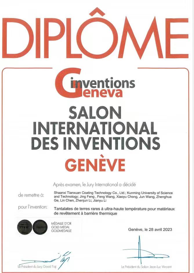 近日,第48届日内瓦国际发明展(International Exhibition of Inventions of Geneva)在瑞士日内瓦举行。昆明理工大学材料科学与工程学院的专利技术Tantalates de terres rares à ultra-haute température pour matériauxde revêtement à barrière thermique(稀土钽酸盐超高温热障涂层材料及其技术)参展并获得金奖。