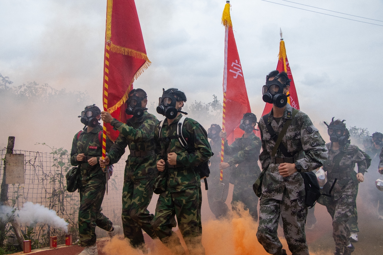 当日7:30,各连队由南向北按1-14连的顺序以二十分钟为间隔时长分批出发。拉练历时近8小时,拉练途中设置核生化防护和防空袭警报科目,旨在磨砺学生意志,强化安全意识,提升战场生存能力。