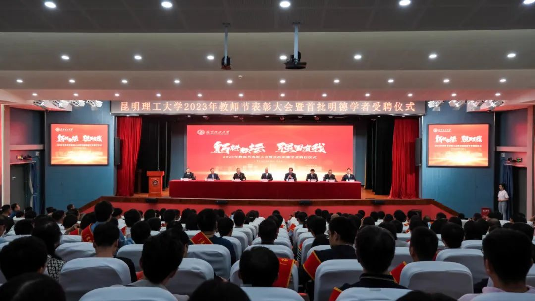 9月7日下午,在第39个教师节来临之际,学校在呈贡校区公教楼小剧场召开2023年教师节表彰大会暨首批明德学者受聘仪式。校党委书记唐家华,校党委副书记、校长王华,校党委副书记蔡金红、降富楼,校党委常委、纪委书记、省监委驻昆明理工大学监察专员陶光荣,校党委常委、副校长杨斌、潘学军、刘殿文出席会议。学校各部门、学院主要负责人,获奖教师代表,2022年入选省部级以上人才,首批明德学者及学生代表参加会议。王华主持会议。