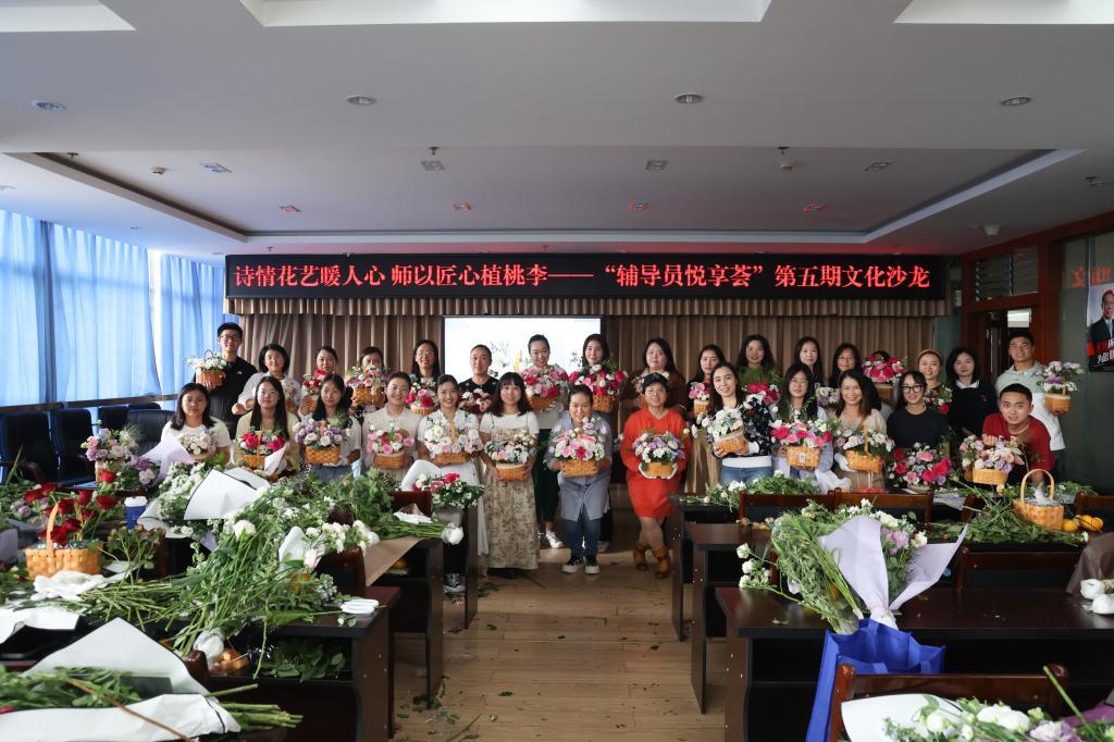 为丰富辅导员业余文化生活,实施辅导员职业关怀计划,在第39个教师节来临之际,学生工作部举办了“辅导员悦享荟”第五期文化沙龙。本次沙龙的主题为“诗情花艺暖人心 师以匠心植桃李”,活动由学生工作部主办,辅导员“微”学习工作室和辅导员文体协会共同承办,共50余名辅导员参加活动。