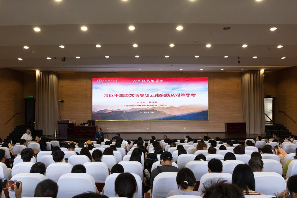 9月20日下午,云南省生态环境厅党组成员、副厅长阿泽新到昆明理工大学以《习近平生态文明思想云南实践及对策思考》为题作形势政策报告。校党委常委、副校长潘学军主持报告会。学校相关学院负责人、思政课教师、辅导员、学生代表共计280余人参加报告会。