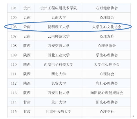 近日,共青团中央维护青少年权益部、中华全国学联秘书处、中国青年报社开展高校学生心理健康社团寻访活动,致力于遴选出一批心理社团直接联系、跟踪培养,合力守护大学生群体的心理健康。昆明理工大学大学生心文化协会从540余个高校心理社团中脱颖而出,将由共青团中央维护青少年权益部、中华全国学联秘书处直接联系,在其指导下开展校内心理健康活动,提供资金支持以及专业培训、社会实践机会,并适时开展心理健康项目分享活动。