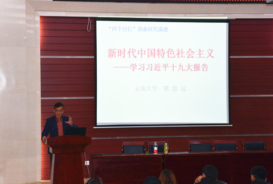10月26日晚,昆明理工大学城市学院邀请云南大学马克思主义学院熊思远教授到新迎校区主讲“新时代中国特色社会主义:学习习近平十九大报告精神”主题党课。城市学院师生党员、发展对象、入党积极分子及主要团学干部共200余人参加学习。