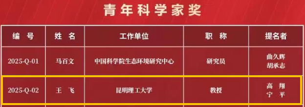 12月15日,中国环境科学学会正式发布2025年度“环境保护科学技术奖”奖励公告,昆明理工大学环境科学与工程学院王飞教授荣获青年科学家奖。“环境保护科学技术奖”旨在推动我国生态环境领域科学技术发展,鼓励科技创新支撑引领,评选在生态环境科学技术研究工作中做出突出贡献的单位和个人。