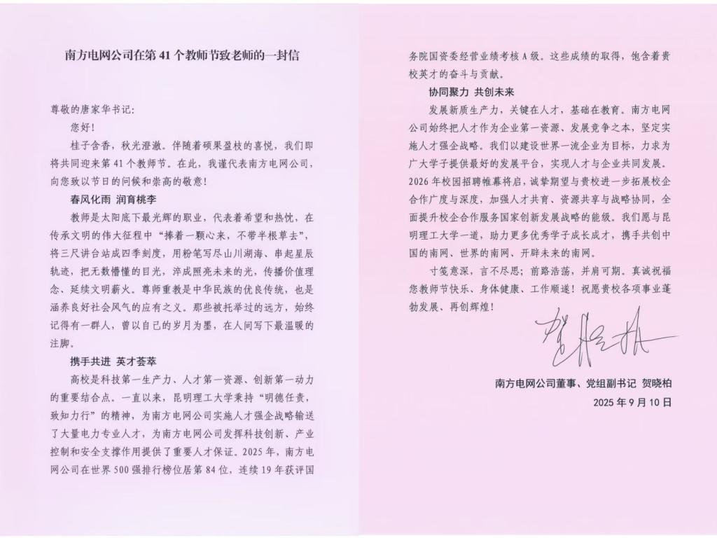 今年9月,中国南方电网有限责任公司董事、党组副书记贺晓柏致信学校党委书记唐家华,围绕国家能源发展战略、校企协同创新及高素质人才培养等方面,表达了深化合作的前瞻思考与积极意愿。