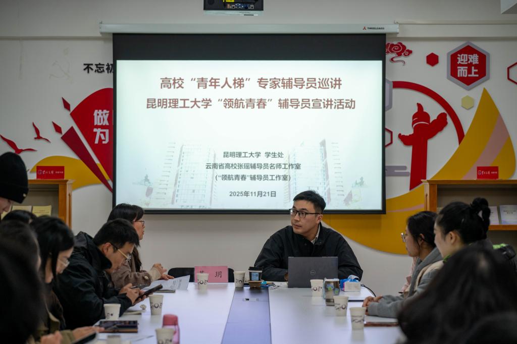 11月21日下午,新时代高校“钢筋铁骨”育人共同体“青年人梯”专家辅导员巡讲活动在呈贡校区憬园智慧团建活动室举办。本次活动由学生处(学生工作部)主办、云南省高校辅导员名师工作室(“领航筑梦”辅导员工作室)承办,特邀西安建筑科技大学辅导员綦玥老师宣讲,学校50余名辅导员和学生骨干参加活动。
